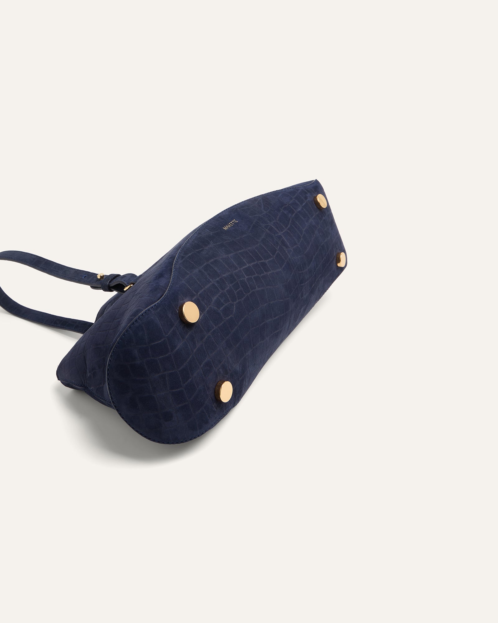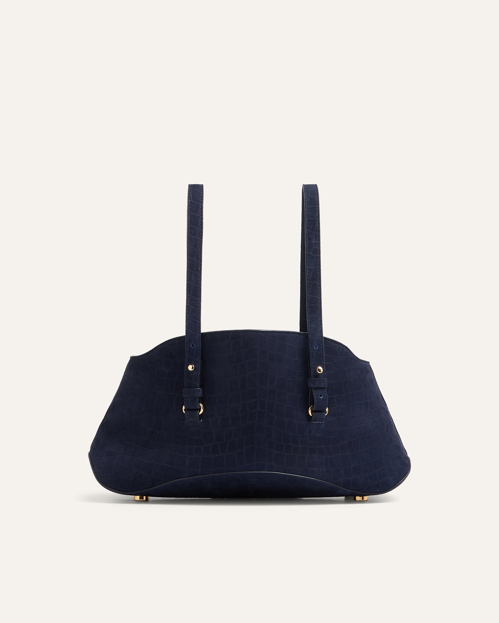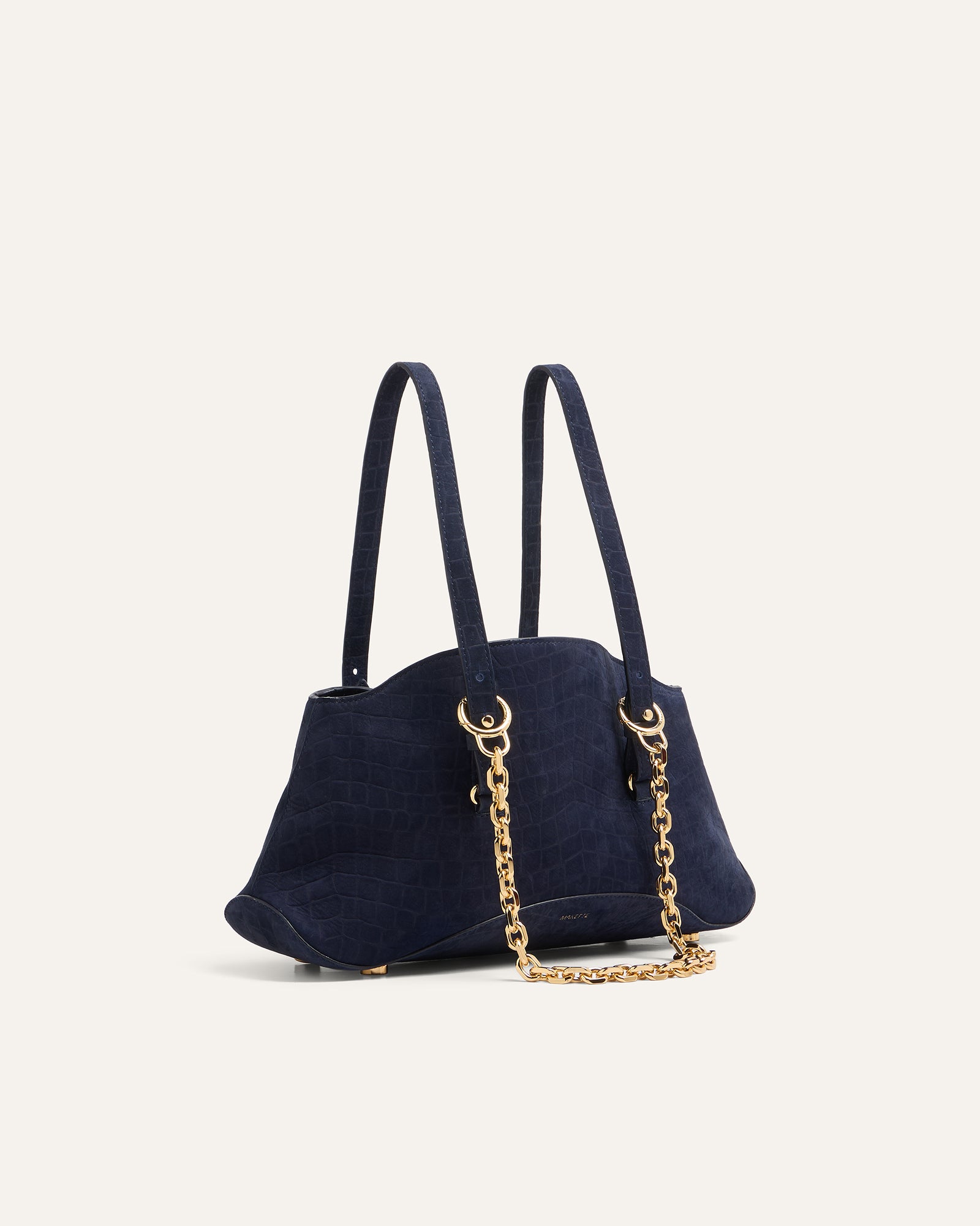 The Curve is MAKETTE’s sculptural bowling bag, defined by softened geometry and subtle tension between structure and movement. This limited-edition version is crafted from a rare alligator-embossed bullhide suede by Remy Carriat, known for its velvety tactility and dimensional finish. The Curve transitions from a wide, arched silhouette into a compact base that hugs the body. A detachable chain adds modularity. It can be worn as a shoulder strap, held by hand, or left to fall as a sculptural anchor for keys or accessories.