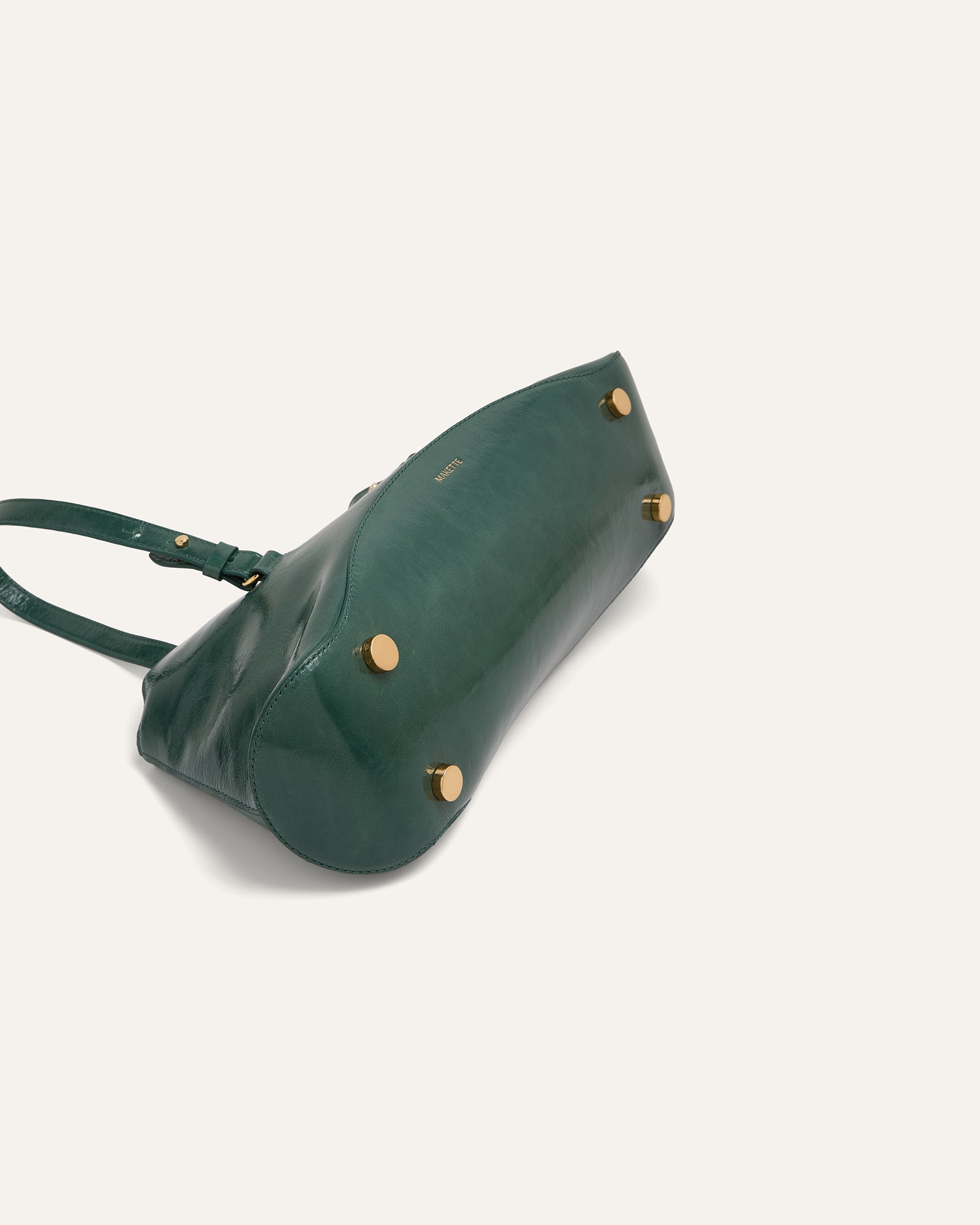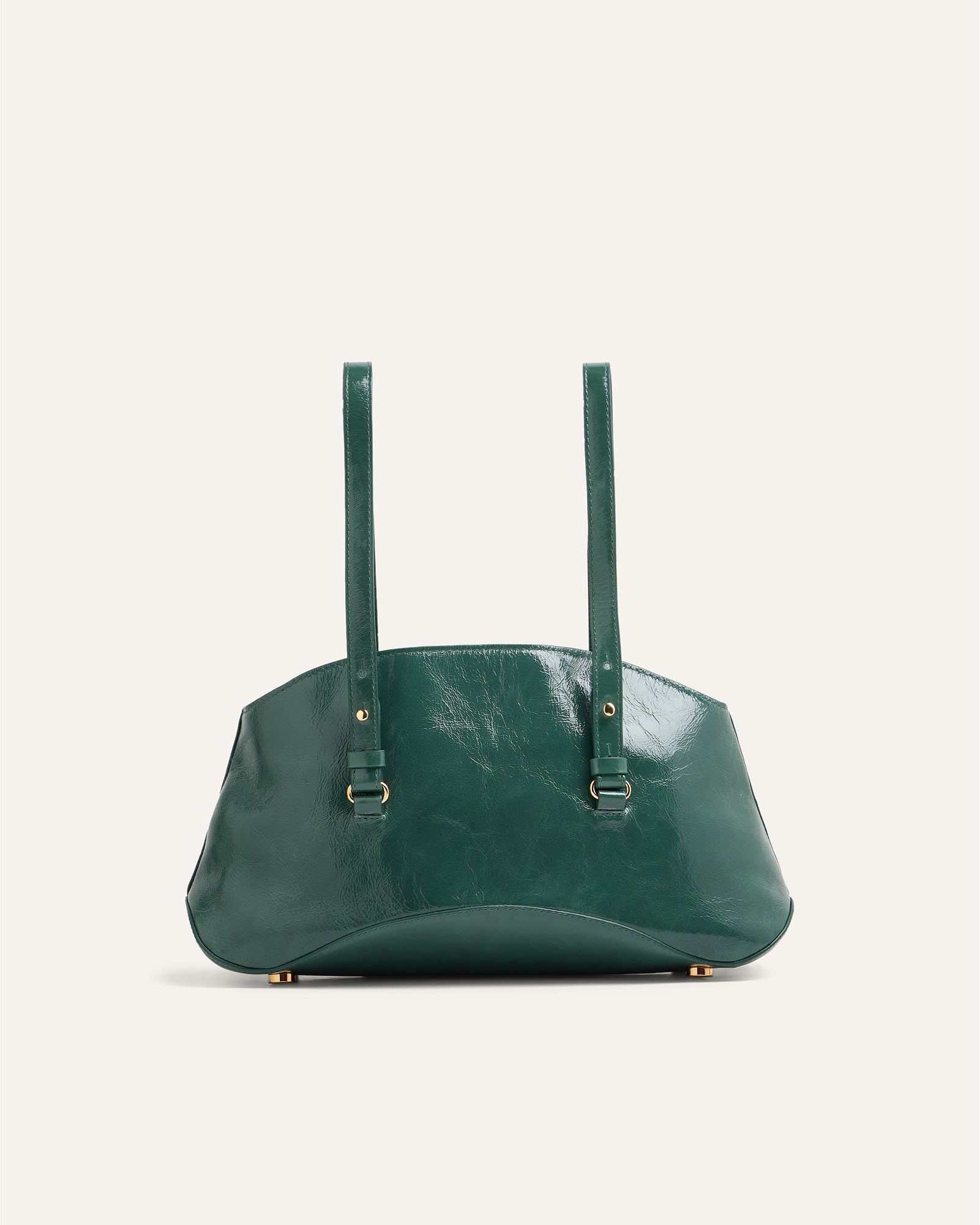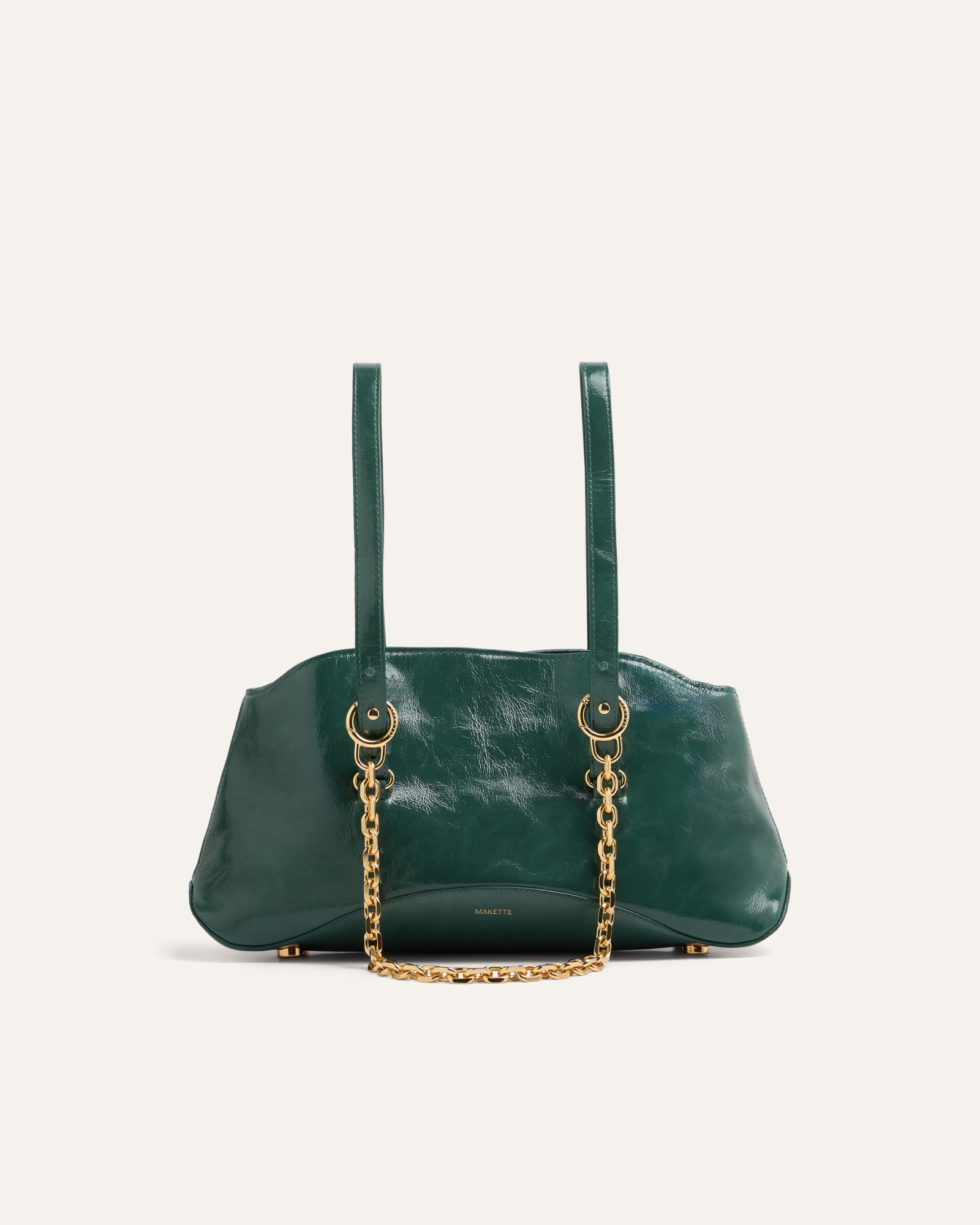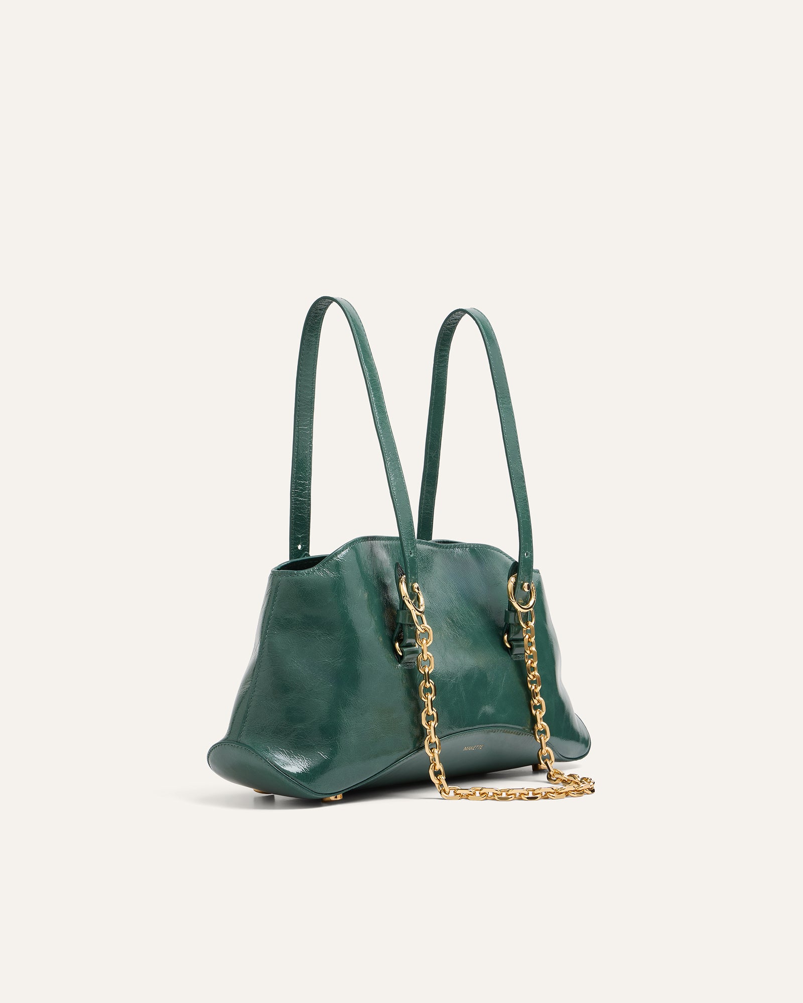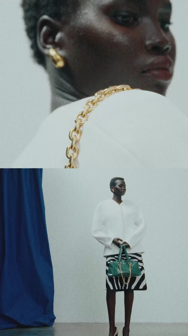 The Curve is a sculptural bowling bag defined by proportion, structure, and the rhythm of curved lines. It transitions easily from handheld to shoulder carry thanks to its integrated gold-plated chain. The chain can also be dropped to the side, transforming into a visual accent or used to secure smaller modular components. A compact profile with surprising volume, designed to adapt to changing needs.
